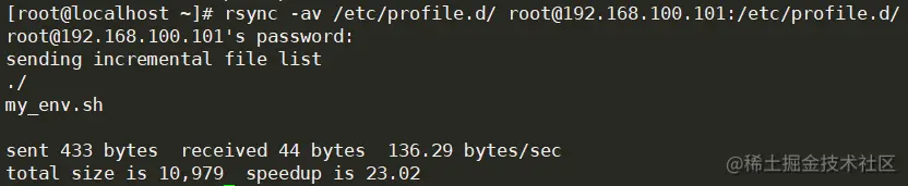 rsync -av /etc/profile.d/my_env.sh root@192.168.100.101:/etc/profile.d/