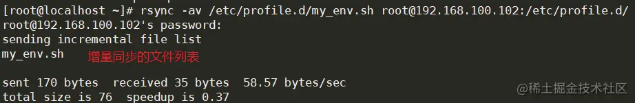 读者会发现 rsync 只同步了被修改的 my_env.sh 文件,我们也就验证了 rsync 增量同步的特性。这个特性非常有用,加入我们在 /opt/module 和 /etc/profile.d 目录下分别放置着非常多的软件目录和配置文件,rsync 能够帮助我们实现修改一处然后同步到多处的需求。