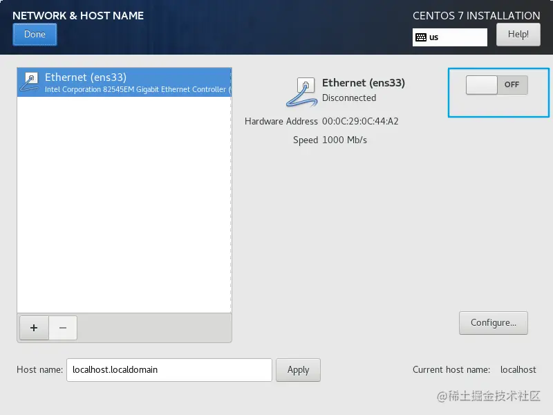 NETWORK & HOST NAME:配置网络,我们要让 centos 能够连接上网络