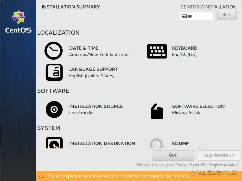 启动虚拟机,完成操作系统设置 如果读者使用的镜像也是 centos 7 的话,接下来的步骤基本相同。选择好语言和键盘后将会跳转到当前界面,