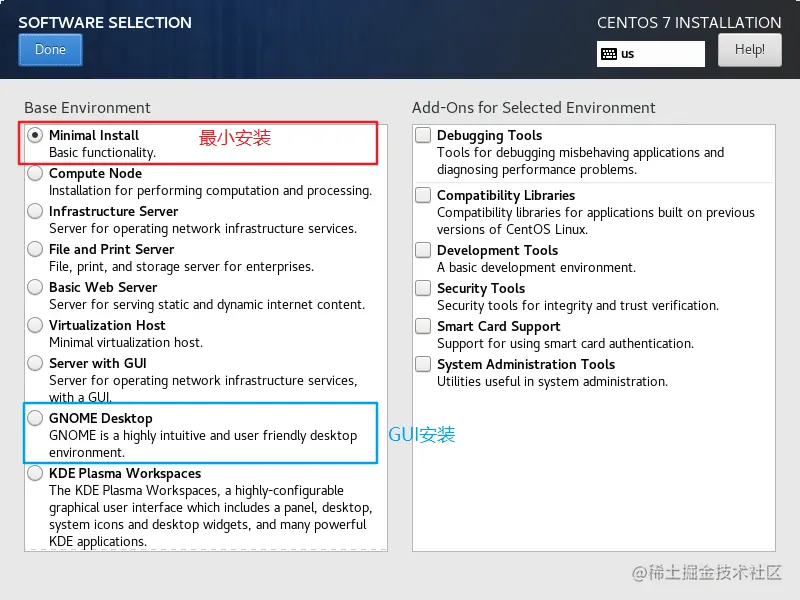SOFTWARE SELECTION:软件设置,我的习惯是只安装一个最小的,只有命令交互界面的 centos,如果读者有使用 GUI 界面的习惯可以选择另外一个选项。