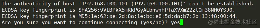 这时候会提示你非对称加密指纹的警告,我们输入 yes 再继续,