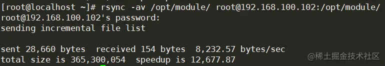 输入密码回车执行后,由于是第一次同步 module 路径,那么第一次肯定是全量同步的,也就是和拷贝是没有什么去别的。当我们重复执行这条命令后,你会发现和 scp 有所不同,