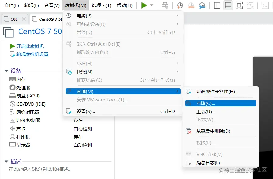 上面我们创建了一个模板虚拟机,现在我们要用它来创建两个 ip 分别为 192.168.100.101 和 192.168.100.102 的虚拟机
