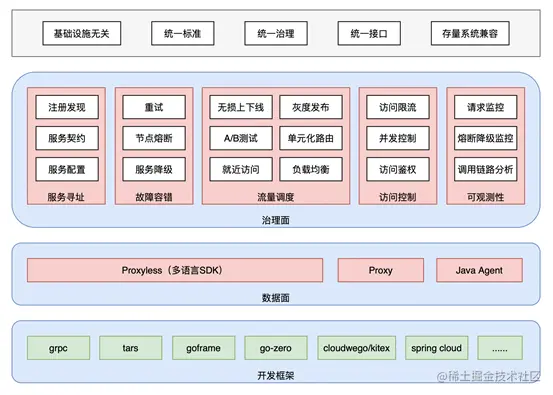 但是,这些框架并不能解决所有的问题,保障大规模服务的稳定运营还需要考虑更多方面,例如:在分布式架构中如何处理基础设施以及应用层的各种异常、如何实现大规模服务的无损发布和流量调度,如何定位和分析复杂调用链路中出现的问题等。对于中大型企业来说,还存在异构的开发技术栈和运行时环境,存在跨地域和混合云的架构要求。如何在更加复杂的应用场景中解决上述问题,企业及开发者面临更多的挑战。