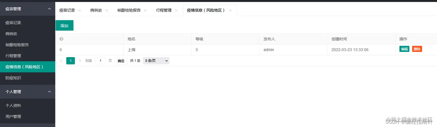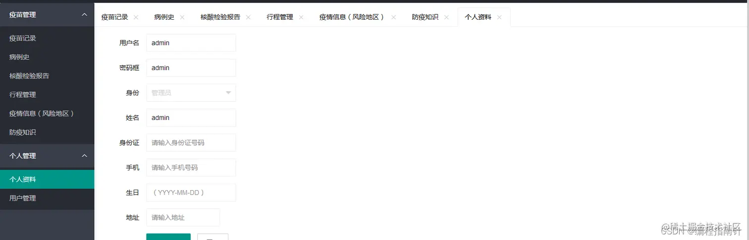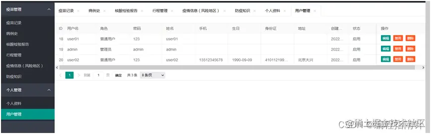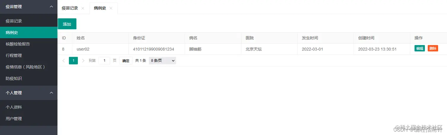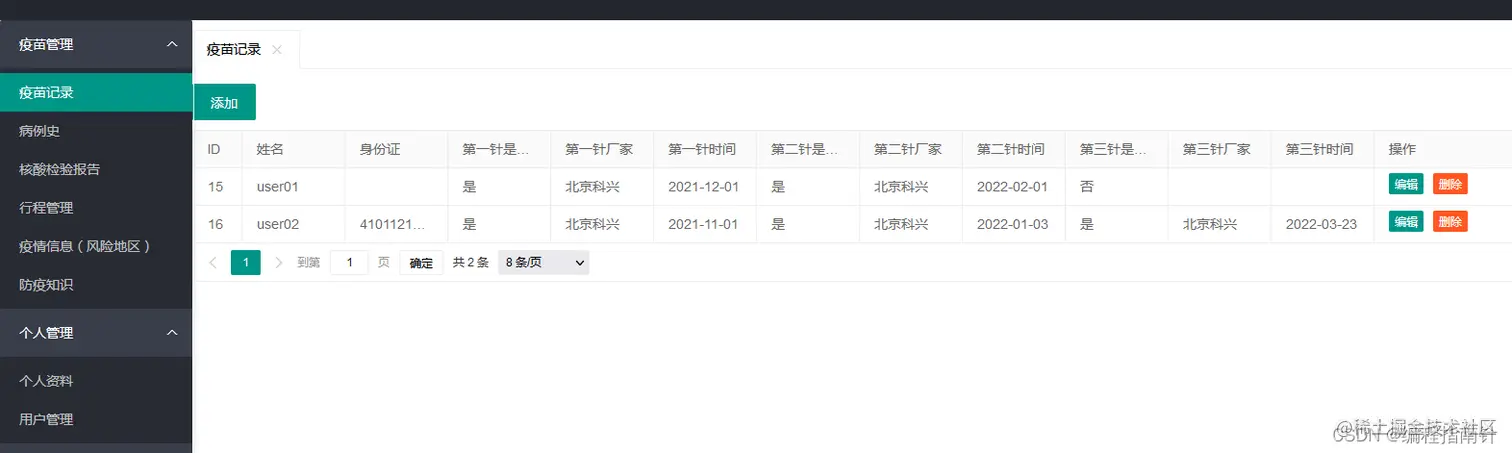 本系统主要实现个人疫苗接种管理、行程管理、病史管理、风险地区管理、核酸检测报告结果上报、疫情新闻管理等功能。系统分为两个角色:管理员和普通用户。管理员可以管理所有人的相关信息,普通用户只能管理自己的疫苗接种等信息,可以查看管理员发布的疫情地区和防疫信息。