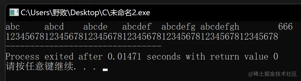 printf("abc\tabcd\tabcde\tabcdef\tabcdefg\tabcdefgh\t666\n12345678123456781234567812345678123456781234567812345678");