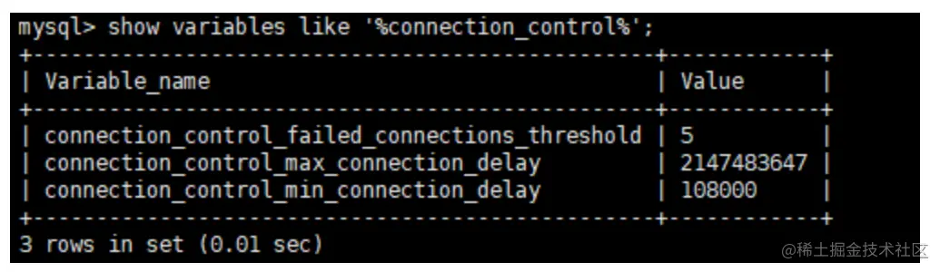 connection_control_failed_connections_threshold:失败登陆次数达到此值后触发延迟。值域:[0, INT_MAX32(2147483647)],0表示关闭此功能。默认值为3。