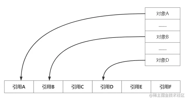 ArrayBlockingQueue底层采用数组存储,但是每次入队都需要创建一个对象入队操作,那么极有可能内存空间不是连续的,==一定一定需要注意的是,这里指的不连续是内存空间,并不是指引用地址==,因为底层存储的是数组所以引用地址是有序存放。如 下所示