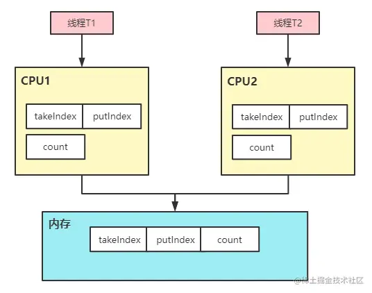 假设CPU加载takeIndex时就会将putIndex、count的值同时加入Catch中,示例图如下所示