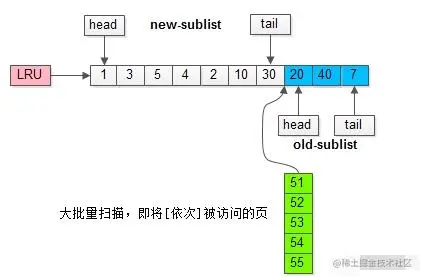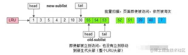 - 页被访问,且在老生代停留时间超过配置阈值的,才进入新生代,以解决批量数据访问,大量热数据淘汰的问题