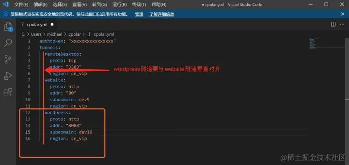 在VS code下载安装完成后,我们就可以对cpolar.yml进行编辑,将cpolar保留的二级子域名添加到cpolar客户端,教会cpolar自动打通本地网站与公众互联网之间的数据隧道。