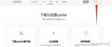 但我们现在还不能直接使用cpolar,因为我们下载到的,是cpolar的客户端,我们还需要对cpolar的服务端进行简单设置。回到cpolar官网,点击页面上方的“免费注册”按钮。
