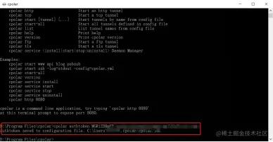 将这个token码复制到本地电脑的cpolar中,以完成cpolar客户端的激活。具体命令为“./cpolar authtoken(官网获得的口令码)”