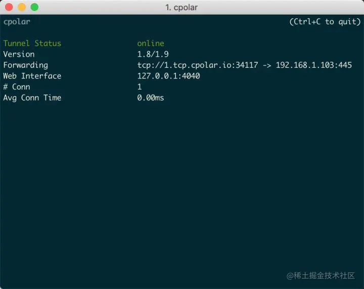 当cpolar显示为以上反馈,则代表我们的cpolar已经激活成功。记下来,我们在cpolar中输入命令“cpolar tcp 192.168.1.103:445”,而cpolar就会生成相应的数据隧道。