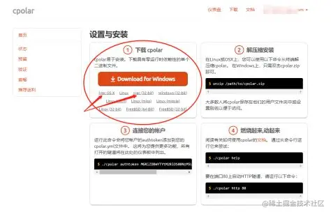 填写完毕相关信息后,即可“创建账号”,接着cpolar云平台自动跳转至下载及设置页面,即“仪表盘”界面