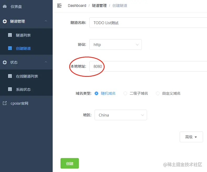 因此我们就需要新建一条数据隧道,此处我们将隧道名称设为“TODO List测试”,根据本地TODO List网页的端口为8080端口,因此我们的数据隧道连接端口也要设定为8080。