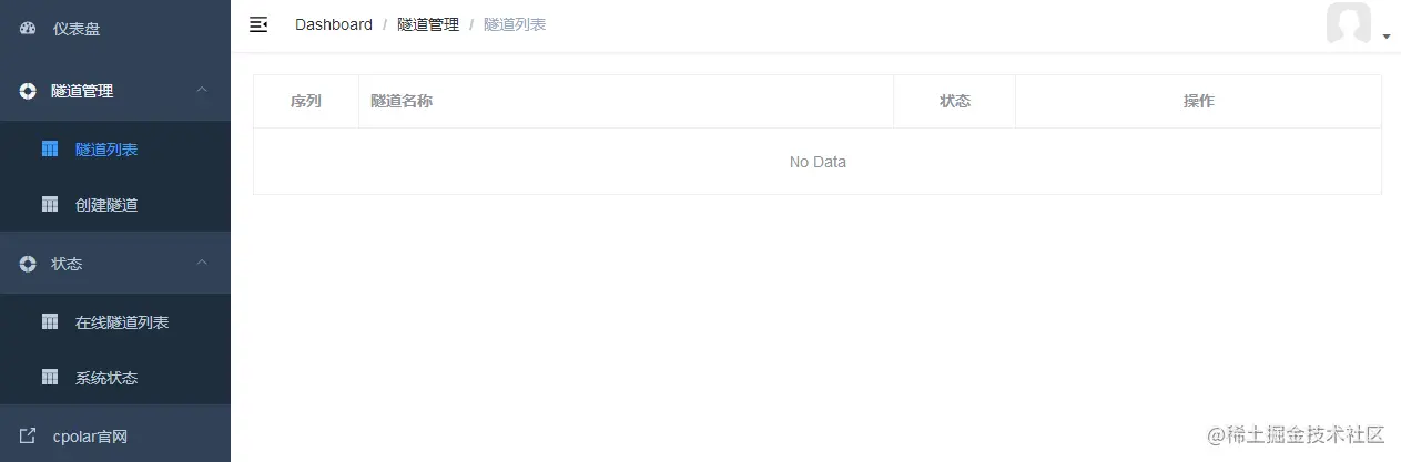 当本地网页建立后,我们就可以打开cpolar,此时的cpolar还没有创建任何数据隧道,因此cpolar客户端的仪表台显示无数据隧道。