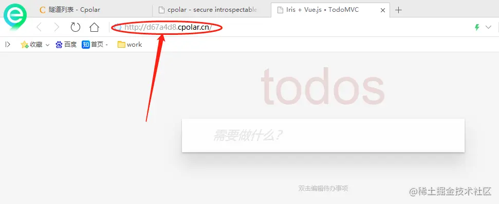 此时我们可以尝试用新建的数据隧道,访问本地的TODO List网站进行测试。将cpolar建立的隧道地址复制下来,粘贴到浏览器中,就可以看到以该URL能够访问到本地的TODO List网页,也就说明cpolar的隧道成功连接了公共互联网和本地网页。