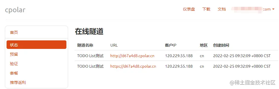 与此同时,cpolar服务器端也会相应的建立起名为“TODO List测试”的隧道。为了方便有需要的客户,cpolar服务器端建立的隧道为两条,分别使用http协议和https协议。