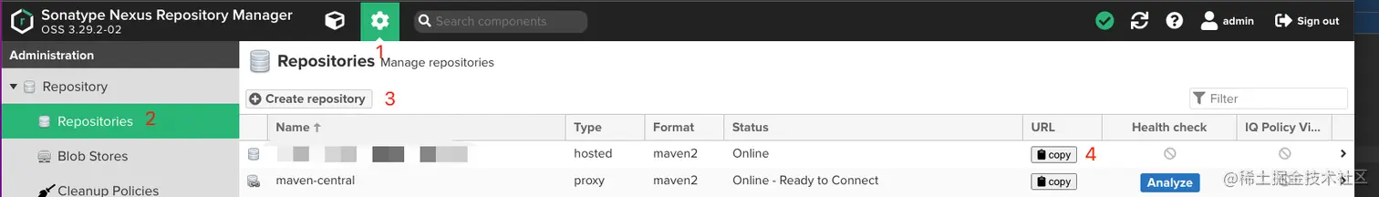 - 点击创建仓库,上图3的位置,在里面创建一个maven仓库就行(可参考下面的2、创建maven的详细步骤)