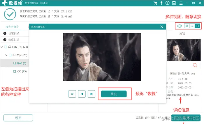 恢复操作: 扫描完成后,可以看到扫描出的各种文件类型都显示在界面的左侧了,我们在里面找到所需文件,也可以在搜索框内查找。最后选择好所需的照片,可先预览一下,还能切换视图查看详细信息,确认无误后开始“恢复”;
