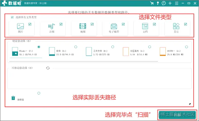 主要操作: 运行软件数据蛙数据恢复专家(www.shujuwa.net/shujuhuifu/ ),然后就要选择两个部分,选择所有文件类型,再根据实际的丢失路径进行选择,最后开始“扫描”;