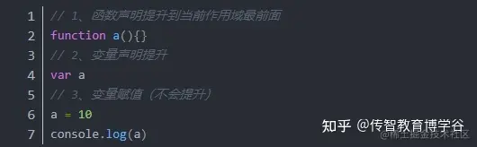 function a(){}这样的函数声明,会把函数声明提升到当前作用域的最前面,注意是最前面。
