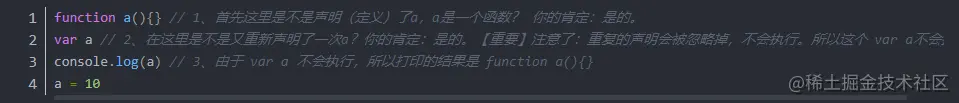 所以根据以上的预解析,然后再逐行执行代码,最后结果打印为10(到这里就解释了为什么一开始上面打印10而不是function a() {}的问题了)。