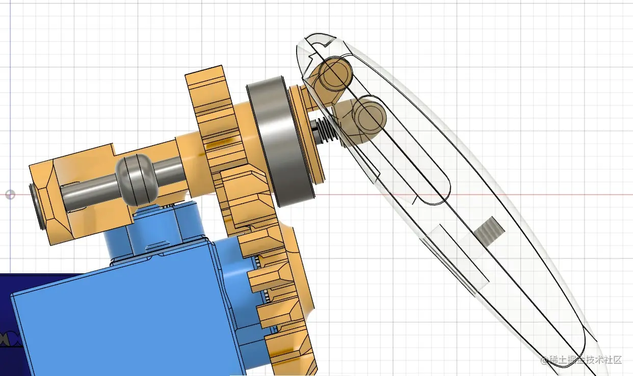 如何实现: 推杆被 M2 螺丝的帽以及一个挡块限制住,当黄色的组件转动的时候,带动推杆左右移动,而推杆的另一端在手臂组件内由一个导槽限制运动方向从而将动力传递到转轴,此方案的力矩是可以双向传递的。