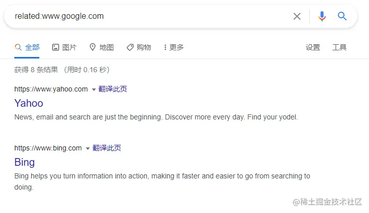 返回所有与目标站点”相似”的页面,可能会包含一些通用程序的信息等,如下可以找到雅虎,必应等搜索引擎