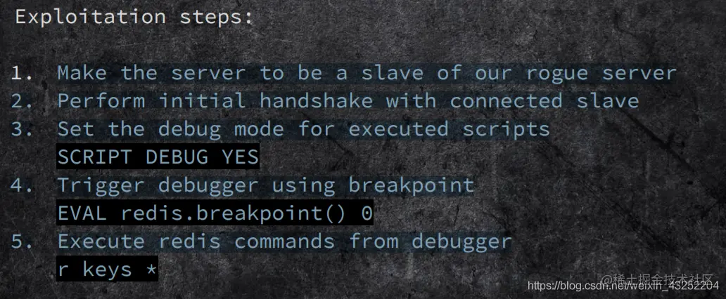 攻击者在本地电脑上开启redis服务,实现主从同步,让待攻击服务器成为我们的从机,之后与待攻击服务器进行初始握手,接下来为执行的脚本设置调试模式,然后使用断点触发调试器,最后借助调试器执行我们的命令,就可RCE!