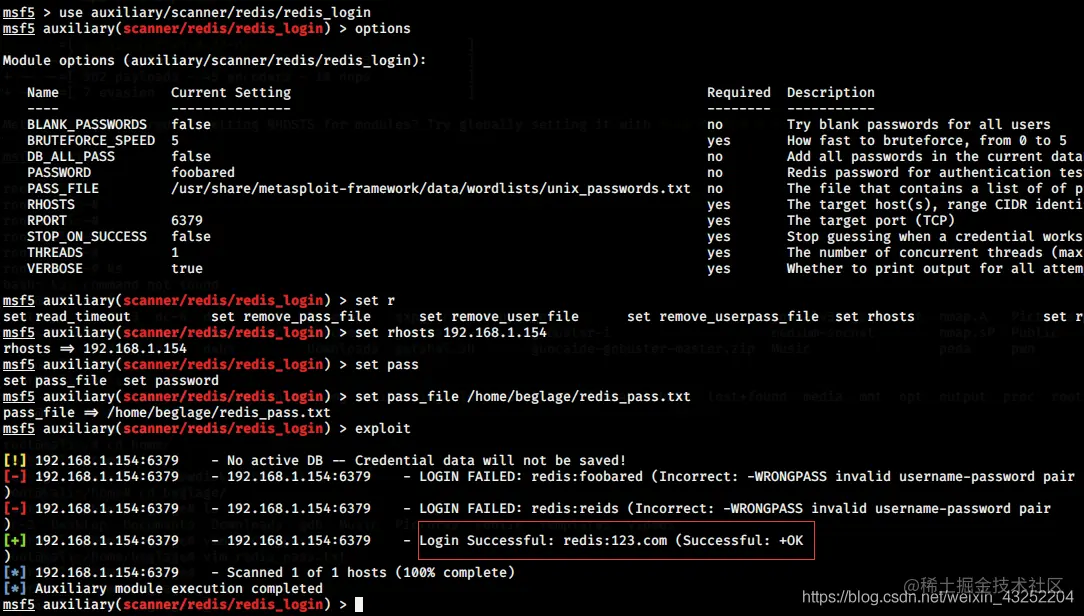 使用msf的auxiliary/scanner/redis/redis_login模块,配置攻击目标和指定字典