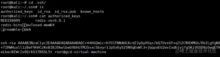可以发现在被攻击kali主机的/root/.ssh目录下已经生成authorized_keys文件