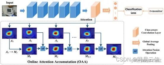 然后与前一epoch保存的特征图A t-1 c进行像素级比较,选择每个像素的最大值,最终输出为作为累积后的响应图M T。在训练完成后,M T即当作弱监督语义分割伪标签的种子区域。