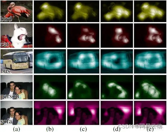 这篇文章的动机简单而直接,作者通过观察发现:在训练收敛前不同的训练阶段,模型所产生的CAM会在同一目标上的不同部位移动,如图4 中的b、c、d表示不同的训练阶段,其CAM(高亮区域)在移动。当整合同一图像在不同阶段产生的CAM时,整合后的CAM更能覆盖完全整个目标,如图4-e。