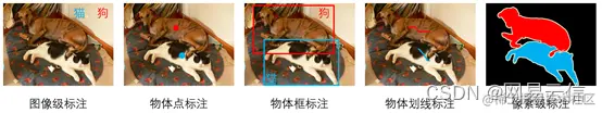 ① 图像级标注:仅标注图像中相关物体所属的类别,是最简单的标注;