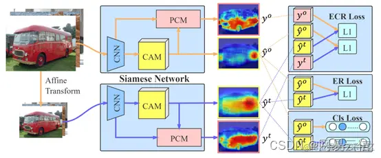 将原始图像和其经过简单的放射变换A(·)后(如缩小、左右翻转)的图像分别送入到共享参数的CNN中获取各自对应的CAM特征图y o和y t,这两个特征图再经过像素关系优化模块Pixel Correlation Module (PCM)的学习后分别得到优化后的CAM特征图y o和y t。其中,PCM是类似于self-attention的操作,query和key是CNN得到的特征图,value是CAM特征。其loss由3部分构成: