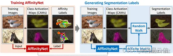 首先利用训练图像的CAM选择多个像素对作为训练样本,并得到语义密切关系的label,这些数据用来训练AffinityNet(如图9左);然后使用训练好的AffinityNet在每张图像上进行推理计算以获取该图像邻接图的语义密切矩阵作为概率转移矩阵;最后在该图的CAM上以random walk的形式使用该矩阵,得到最终优化后的语义分割伪标签(如图9右)。