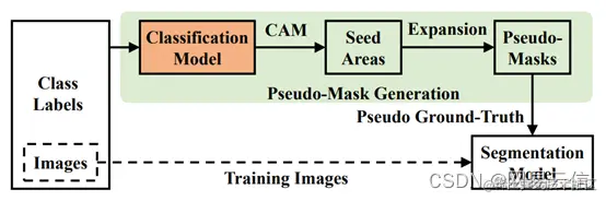 首先,利用图像级标注的图像类别标签通过单标签或多标签分类的方式训练出一个分类模型,该分类模型通过计算图像中相应类别的类别特征响应图CAM[3]来当作分割伪标签的种子区域;接着,使用优化算法(如CRF[4]、AffinityNet[5]等)优化和扩张种子区域,获得最终的像素级的分割伪标签;最后,使用图像数据集和分割伪标签训练传统的分割算法(如Deeplab系列[6])。