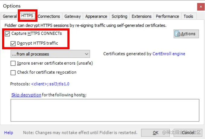 b. 切换到 HTTPS 选项卡,勾选 Capture HTTPS CONNECTs,勾选 Decrypt HTTPS traffic