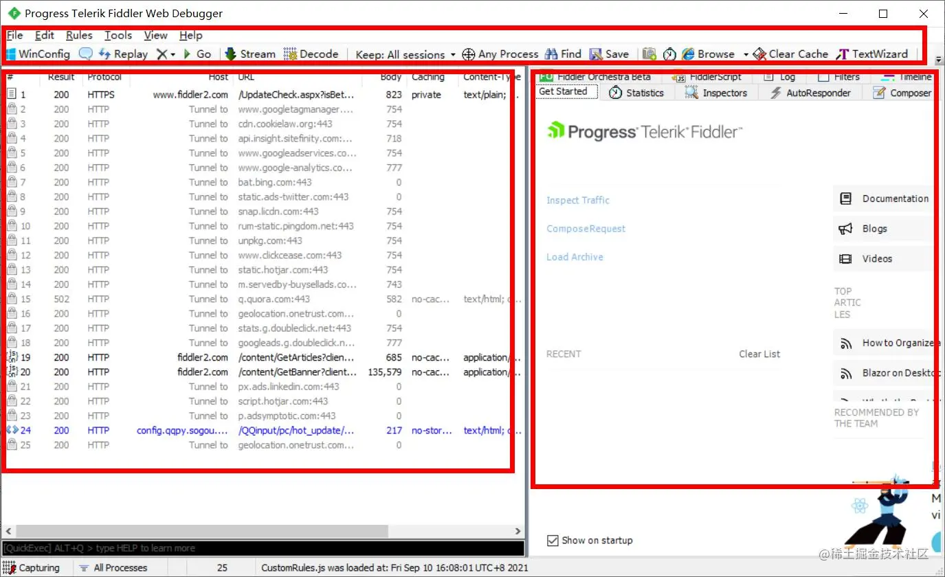 Fiddler 主要分为三个模块,顶部菜单栏,左侧抓包面板,右侧抓包数据相关面板。