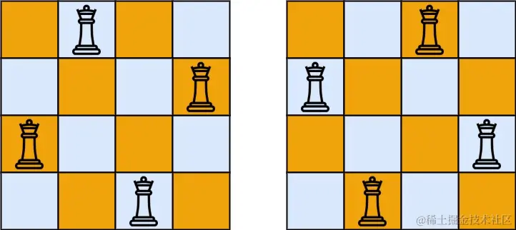 解释:如上图所示,4 皇后问题存在两个不同的解法。