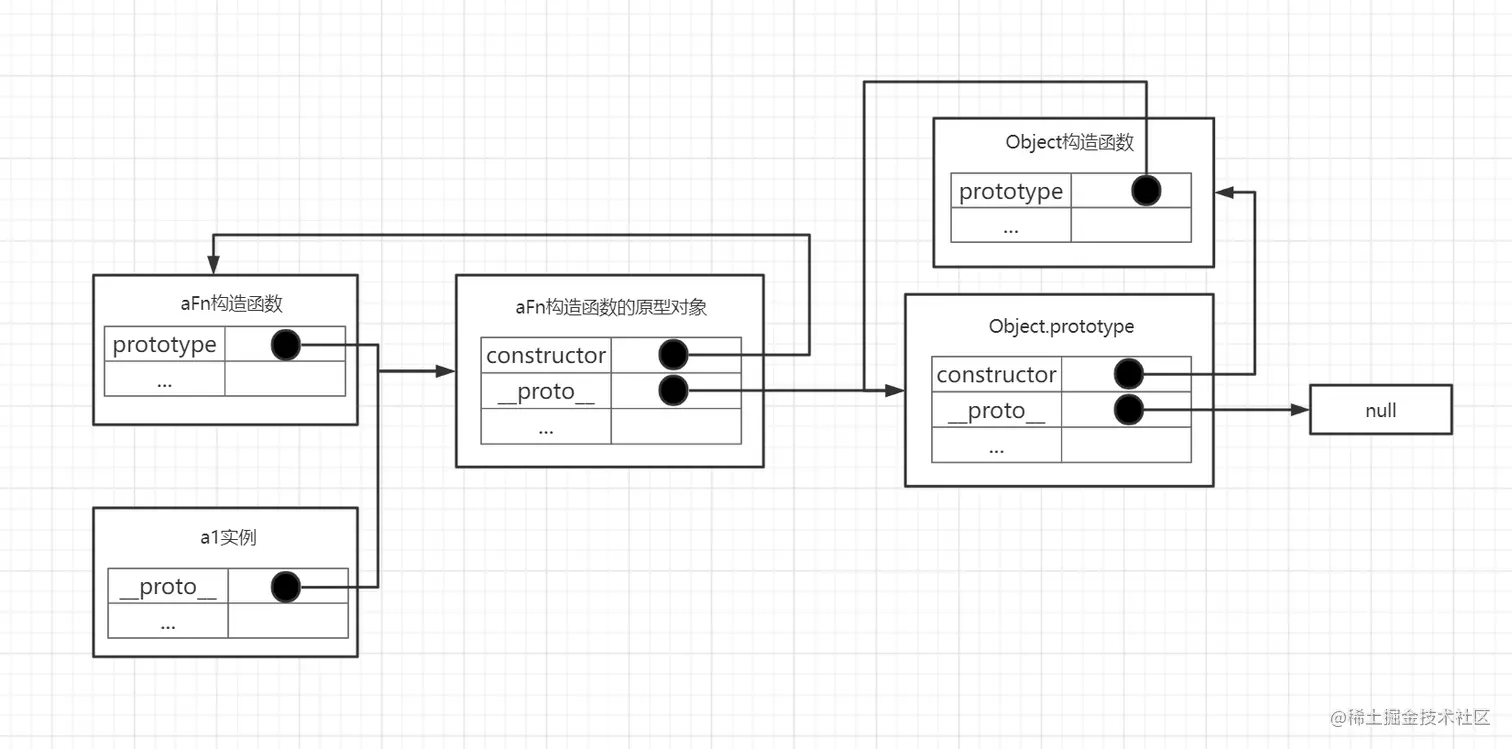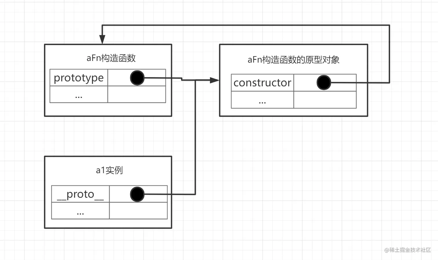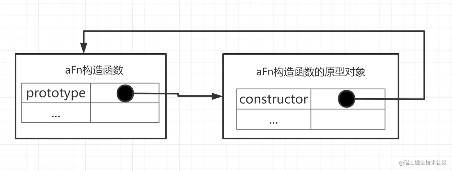原型对象有一个constructor属性,又指回了构造函数aFn。(但在后面的作图中,我们都用aFn.prototype来表示aFn构造函数的原型对象。)