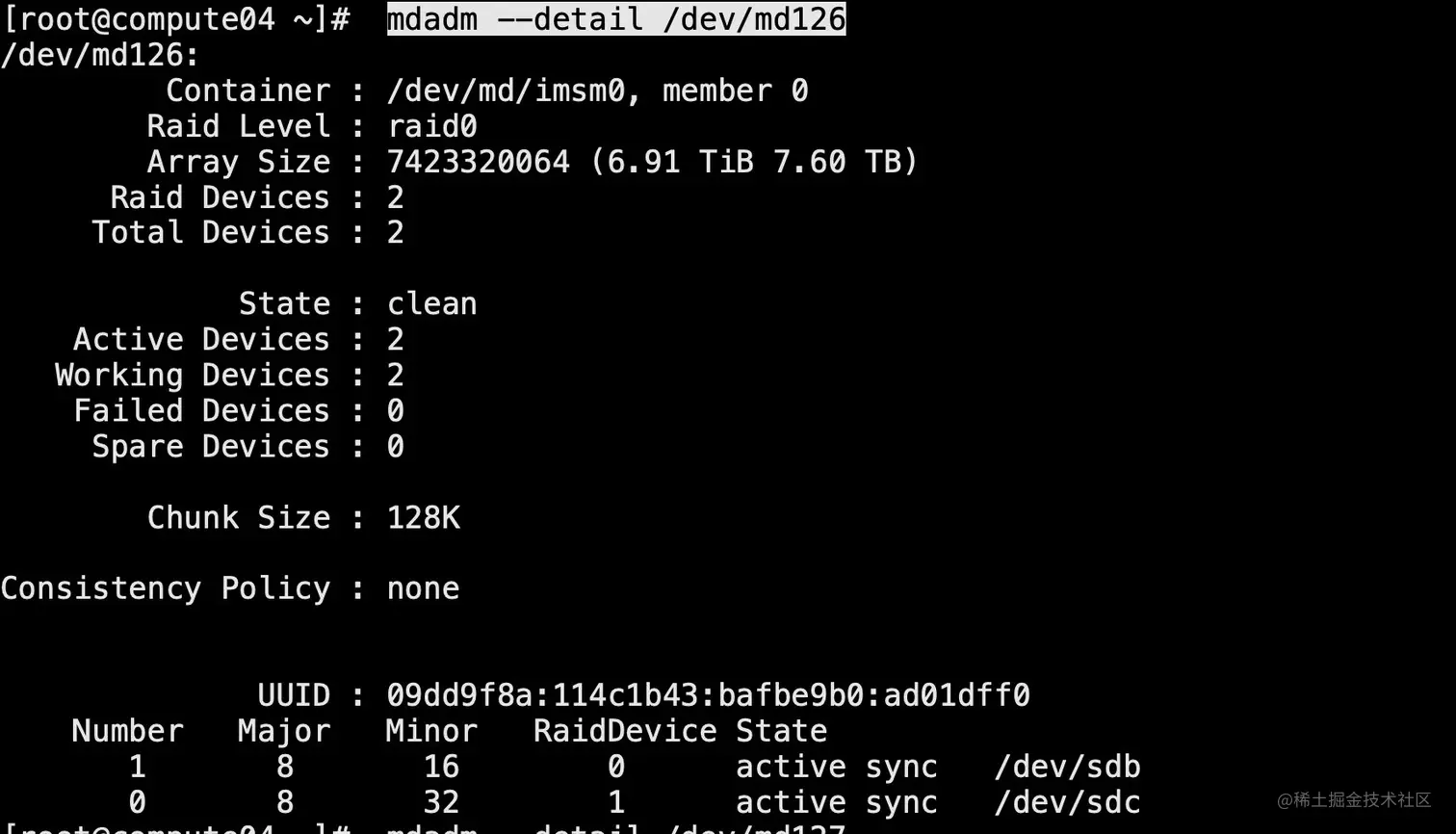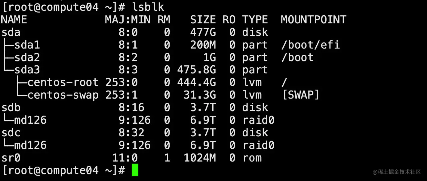 从sdb和sdc中可以发现,下方均单独创建了一个分区"md126",通过以下命令来查看分区的细节。