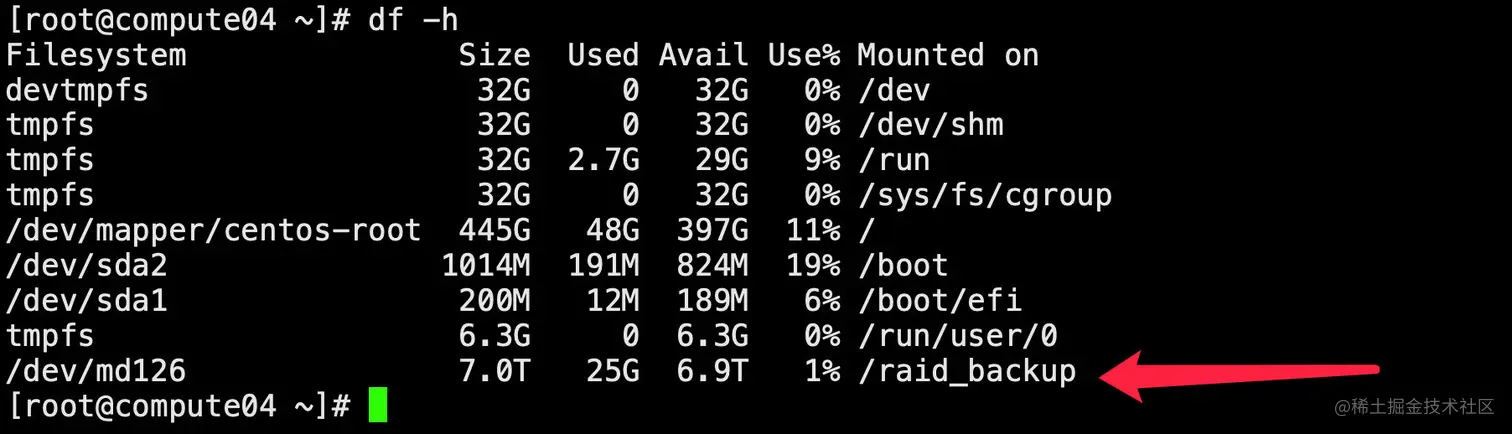 格式化之后,创建一个目录用于挂载点,我这里在根目录下创建一个文件夹raid_backup,用于文件备份。可根据自己情况对应修改文件夹名。