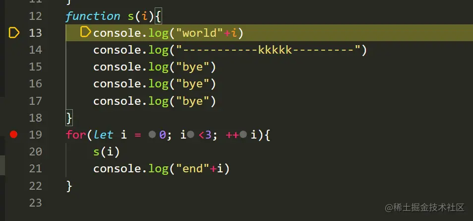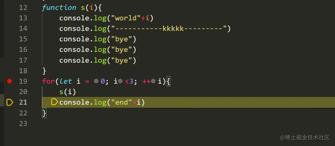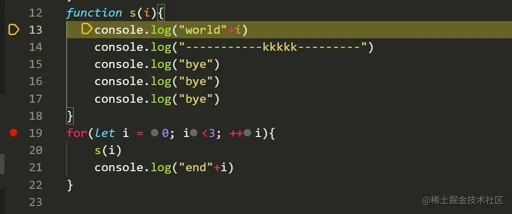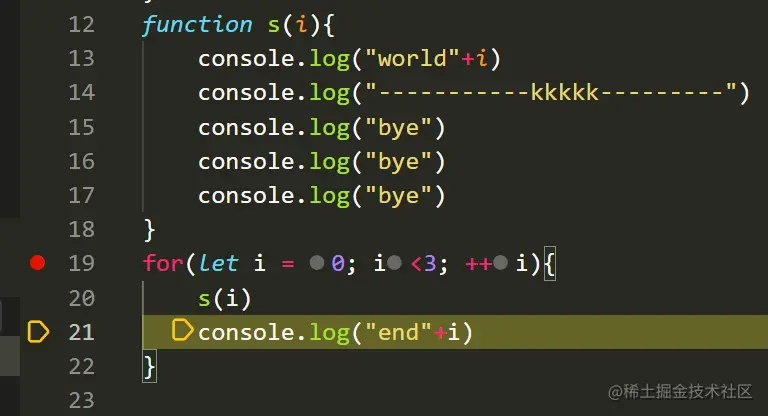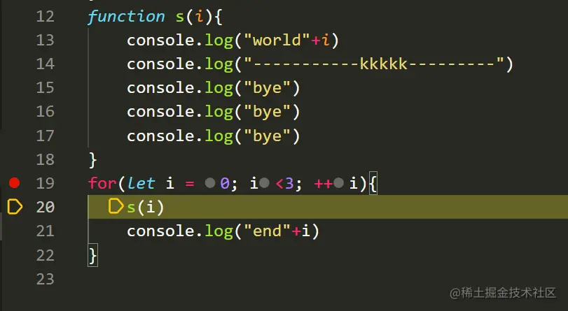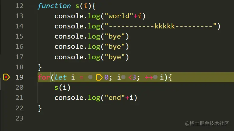 单步跳出,在单步调试进入到函数内部时候,进行一次性执行完函数内剩下代码,跳出函数的操作,例如使用场景,在进入s函数后,我调试到"-----------kkkkk---------"一步后,s函数剩下的代码我一次性执行完回到调用完s函数处的下一步即console.log("end"+i)处,就可以使用单步跳出。