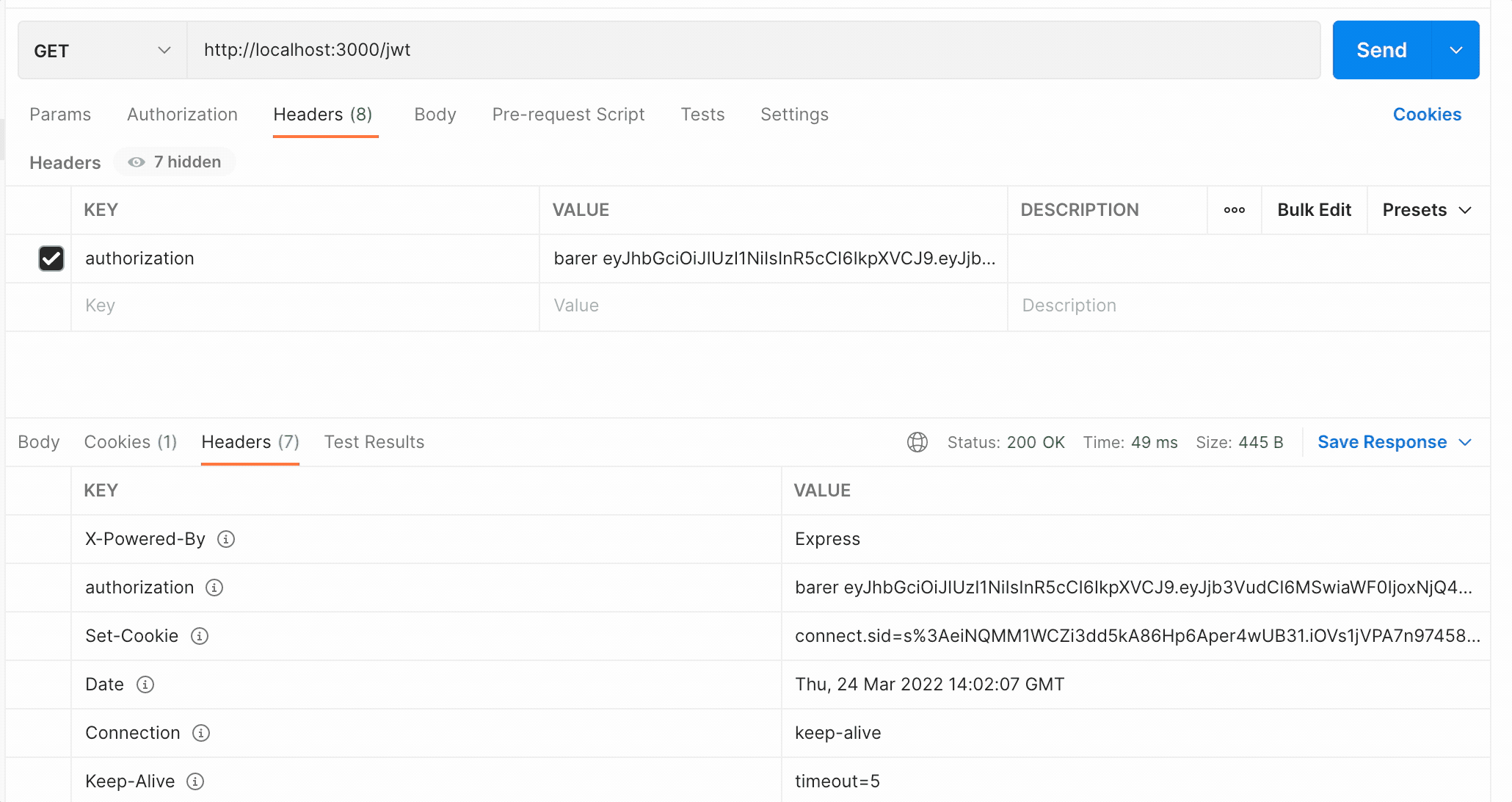 session + cookie 的方式用起来还是很简单的,我们再来看下 jwt 的方式: