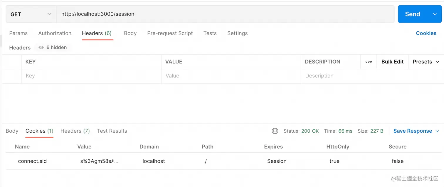 可以看到每次请求返回的数据都不同,而且返回了一个 cookie 是 connect.sid,这个就是对应 session 的 id。