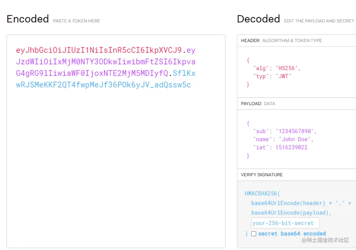 header 部分保存当前的加密算法,payload 部分是具体存储的数据,verify signature 部分是把 header 和 payload 还有 salt 做一次加密之后生成的。(salt,盐,就是一段任意的字符串,增加随机性)